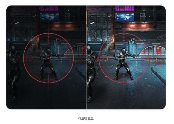 어두운 화면의 명암비를 높여 숨어있는 적을 쉽게 찾을 수 있게 도와주는 다크맵 모드 역시 실제 게임 플레이 시 큰 도움이 되었어요. 업무와 취미 생활을 동시에 즐기고 싶은 분들에게 적절한 타협점이 되는 제품이었어요.