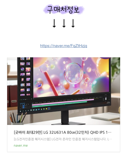 LG 32U631A는 대화면의 시원함과 QHD의 선명함 그리고 100Hz의 부드러움을 모두 갖춘 균형 잡힌 모델이었어요. IPS 패널 특유의 화사한 색감과 USB-C 단자의 편의성 덕분에 업무 능률이 한층 올라간 기분이 들었어요. 스피커가 내장되어 있지 않다는 점은 조금 아쉽지만 별도의 스피커나 헤드셋을 사용하는 분들이라면 큰 단점이 되지는 않을 것 같아요. 넓은 화면으로 시원하게 작업하고 싶은 직장인이나 학생분들에게 강력하게 추천드립니다.