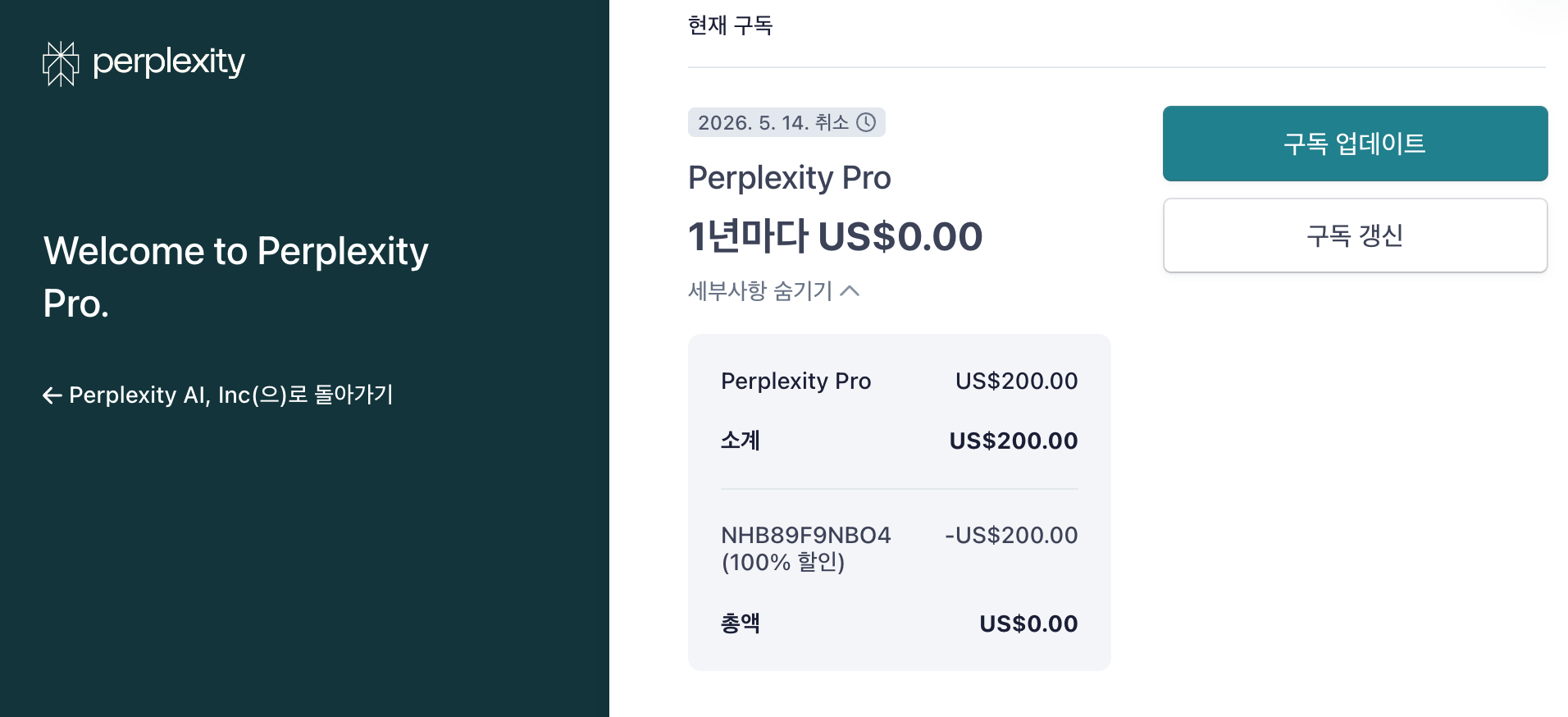 최종적으로 퍼플렉시티 프로 유료버전이 1년동안 활성화된 것을 확인할 수 있었습니다.