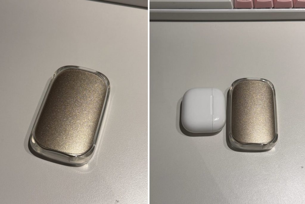 색상은 샴페인 골드 느낌인데, 알루미늄 소재라 그런지 꽤 고급스럽습니다. 크기는 명함보다 작고(74mm x 46mm), 무게도 53g밖에 안 돼서 주머니에 넣고 다녀도 있는지 모를 정도예요. 카페에서 작업할 때 테이블 위에 꺼내두면 “이거 뭐야?”라고 물어보는 지인들이 많았어요. 디자인 하나는 확실히 먹고 들어갑니다.