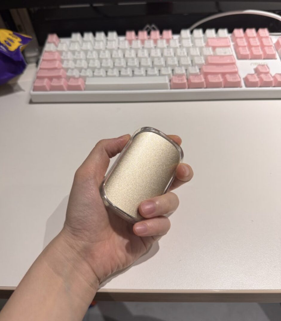 색상은 샴페인 골드 느낌인데, 알루미늄 소재라 그런지 꽤 고급스럽습니다. 크기는 명함보다 작고(74mm x 46mm), 무게도 53g밖에 안 돼서 주머니에 넣고 다녀도 있는지 모를 정도예요. 카페에서 작업할 때 테이블 위에 꺼내두면 “이거 뭐야?”라고 물어보는 지인들이 많았어요. 디자인 하나는 확실히 먹고 들어갑니다.