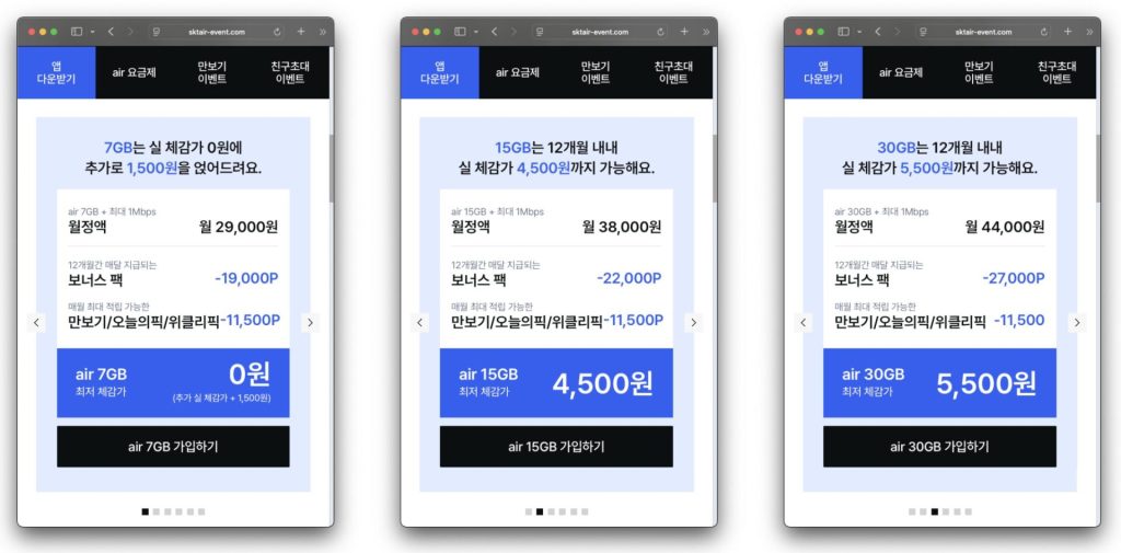 | air 7GB | 7GB (1Mbps) | 29,000원 | 0원 (+1,500원 이득) |