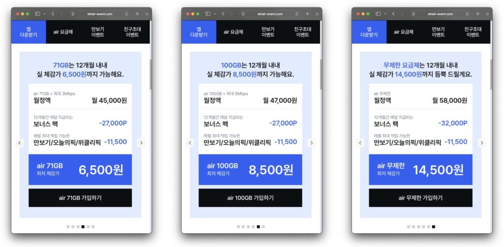 | air 71GB | 71GB (3Mbps) | 45,000원 | 6,500원 |