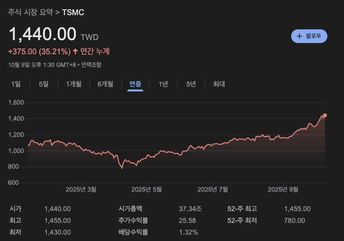 TSMC의 PER(주가수익비율)은 약 25배 수준으로, 엔비디아(80배 이상)나 브로드컴(40배 내외)과 비교하면 여전히 저평가된 상태입니다. 반면 기술력과 수익성은 오히려 더 안정적이죠. 이 때문에 시장에서는 “TSMC는 느리지만 확실하게 성장하는 반도체의 근본주”라는 평가가 나옵니다.