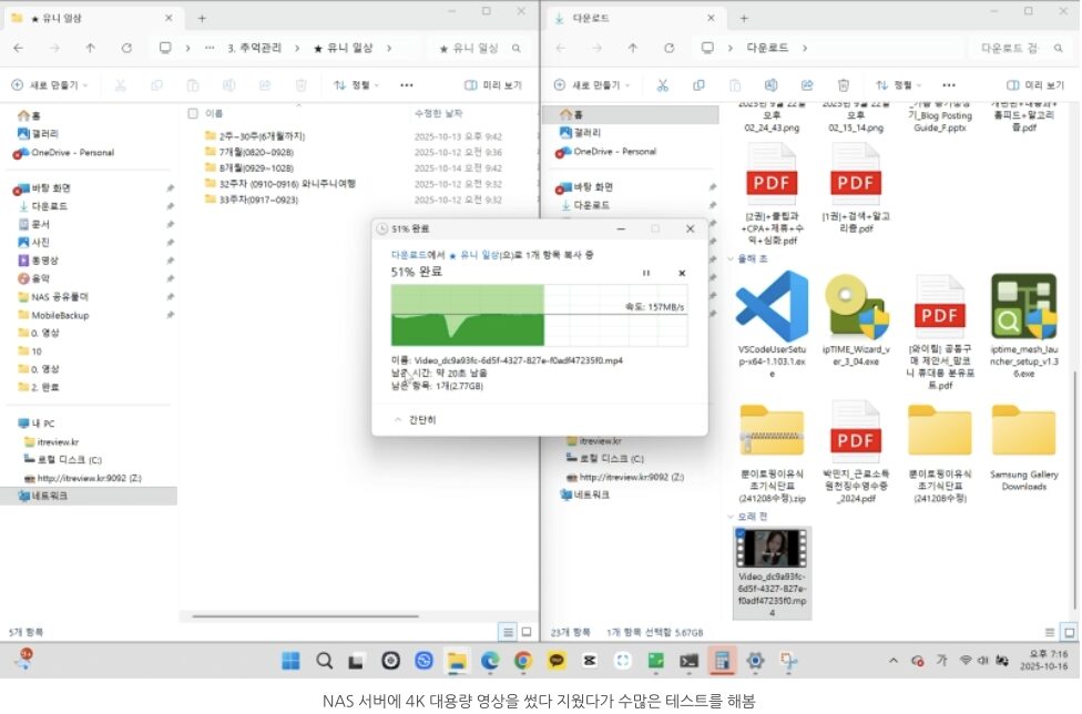 내부망에서 시놀로지 NAS 장비를 두고 파일 복사를 테스트한 것이기 때문에 외부 변수는 최대한 차단된 상태로 진행하였습니다.