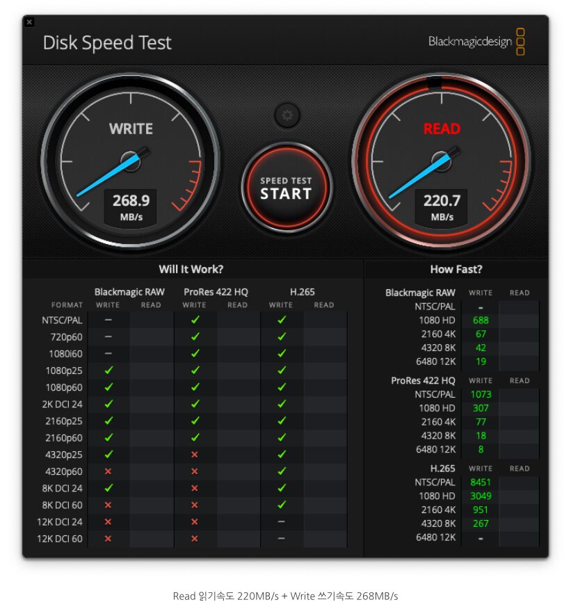 번외로 위 사진은 제 맥북프로에서 NAS 장비를 유선 접속할 때의 속도 측정결과에요. 사실 220MB/s 정도까지만 나와주면 NAS에 꽃혀있