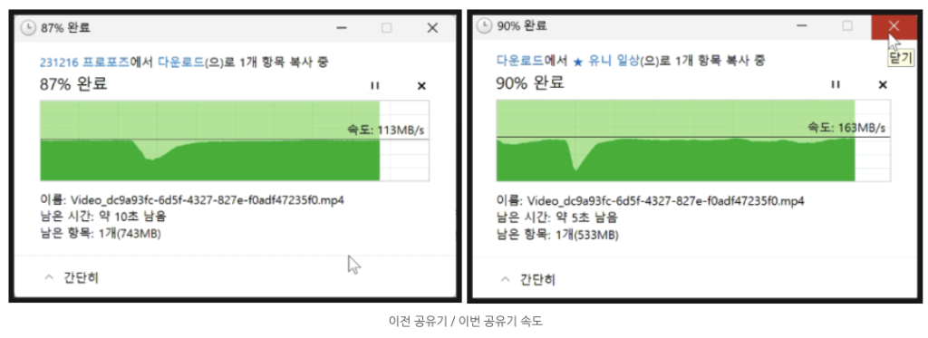 그리고 같은 위치, 같은 클라이언트로 붙여 SMB (윈도우 공유폴더) 파일 복사 속도를 확인했습니다.
