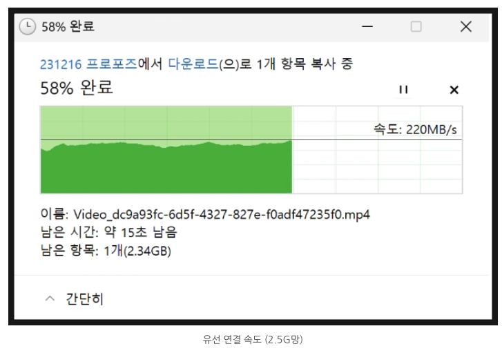 참고로 2.5G 유선 연결했을 경우 220MB/s 정도는 나와주었기 때문에 다른 병목현상은 아닙니다.