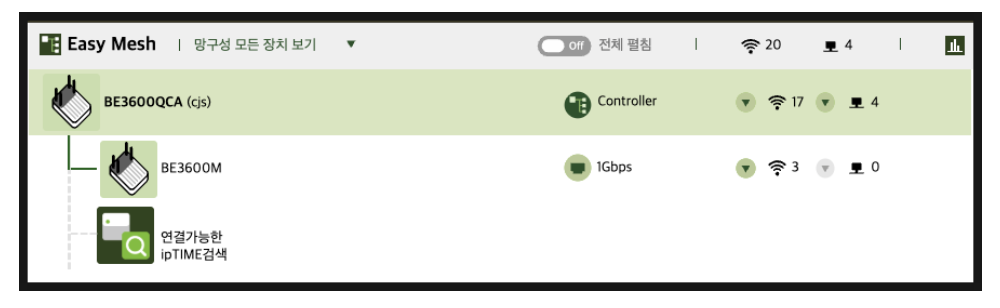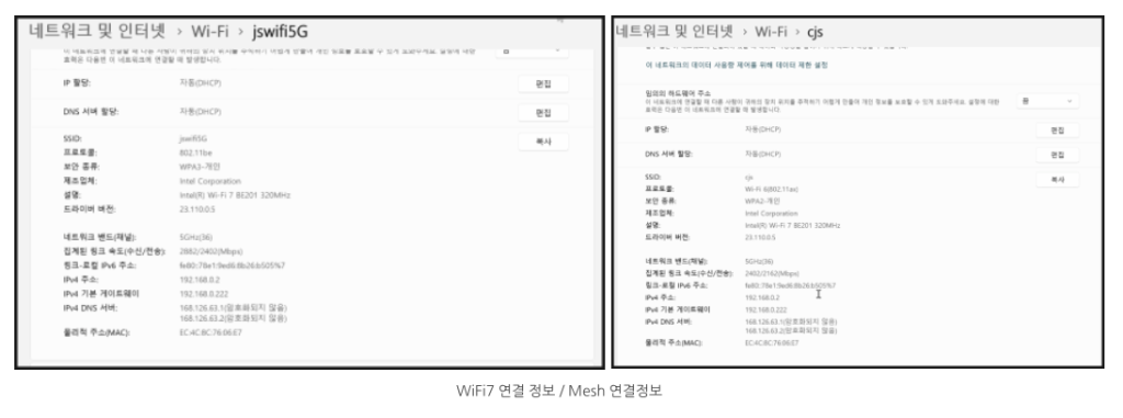 참고로 아이피타임은 WiFi7 모델끼리 Mesh 구성하더라도 6E(ax)로 떨어지는 현상이 있어 MESH 구성을 해제하고 단일 무선 AP로 실험하였습니다.